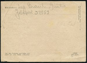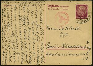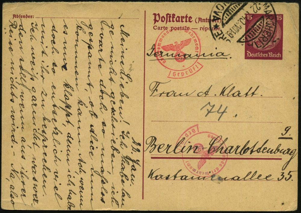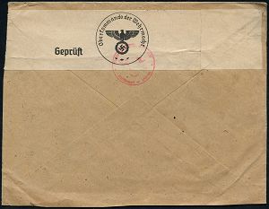 2553 | 40 € | II. WELTKRIEG (1939 - 1945) : ITALIEN / DEUTSCHES REICH 1940/41 3 Antwort-P. 15 Pf. Hindenburg , je 1K-Gitter: GENOVA... , 2x kleiner, roter OKW-Zensur-1K-Segment: Geprüft.. = München (Rie.D-1, + 400 Pkte.) u.a., 3 Belege (geringe Bedarfsspuren) aus einer Korrespondenz n. Berlin-Charlottenburg (3x Mi.P 230 A, + 54.- EUR) | ![]() ![]() ![]() | |