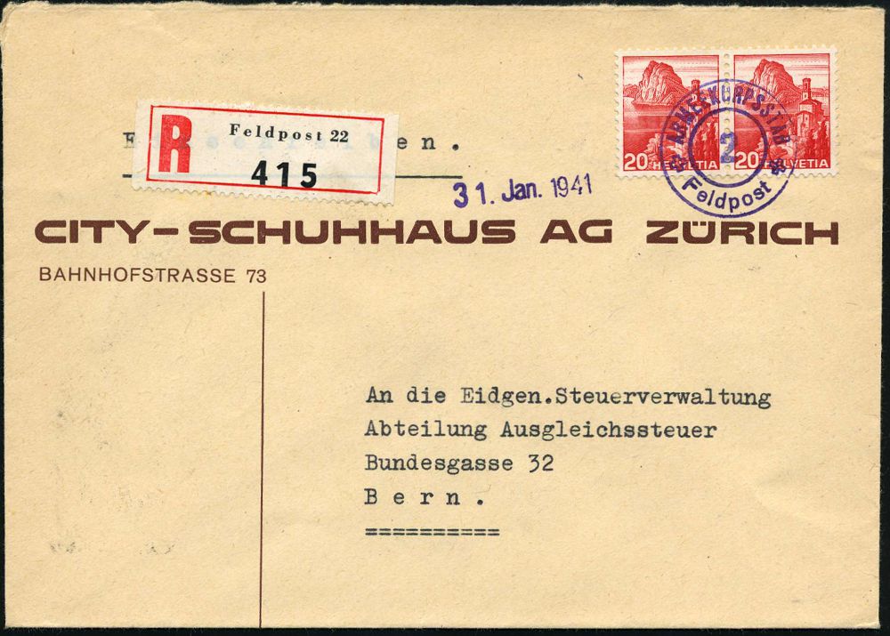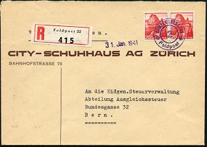 2582 | 18 € | II. WELTKRIEG (1939 - 1945) : SCHWEIZ 1941 (Jan.) 20 C. Freimarke (Castagnola) Paar, viol. Feldpost-2K: ARMEEKORPSSTAB/2/Feldpost + RZ: F e l d p o s t 22 ,klar gest. Feldpost-R-Bf. n. Bern (Mi.327 MeF) | ![]() | |