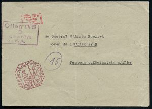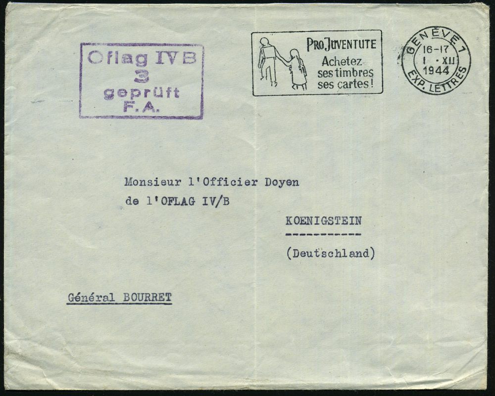 2583 | 18 € | II. WELTKRIEG (1939 - 1945) : SCHWEIZ 1944 (1.12.) MWSt.: GENEVE 1/PRO JUVENTUTE/Achetez/ses timbres/ses cartes! = 2 Kinder (Hand in Hand) + viol Zensur-Ra.: Oflag IV B/3/geprüft/F. A. = Kgf.-Lager Königstein, Sachsen! (Bf. gefaltet) klar gest. Krgiegsgef.-Zensur-Bf. | ![]() | |