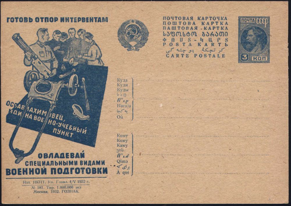 2590 | 30 € | II. WELTKRIEG (1939 - 1945) : UdSSR 1932 3 Kop. BiP Bauer, blau: Sei bereit zur Abwehr der Interventen.. = Ausbildung von Zivikisten am wassergekühlten s.MG "Maxim" (möglich durch OSOAWIACHIM-Lotterie) ungebr., selten! (Mi.P 126/181) | ![]() | |