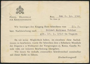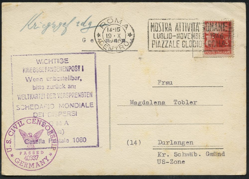 2555 | 35 € | II. WELTKRIEG (1939 - 1945) : ITALIEN / VATIKAN 1946 (19.10.) frankierte Dienst-Kt.: PÄPSTl. HILFSSTELLE FÜR KRIEGSGEFANGENE (Papst-Wappen) + viol. Ra.-HdN: WICHTIGE/KRIEGSGEFAGNENENPOST.. ROMA , gest. ROMA CENTRO US-Eingangs-Zensur, viol. 1K: U.S. CIVIL CENSORSHIP/PASSED/40337/GERMANY, klar gest. Ausl.-Zensur-Kt. n. Durlangen, der Vatikan ermöglichte auch NS-Verbrechern wie Eichmann u. Mengele über die sogn. "Rattenlinie" die Flucht n. Südamerika! | ![]() ![]() | |