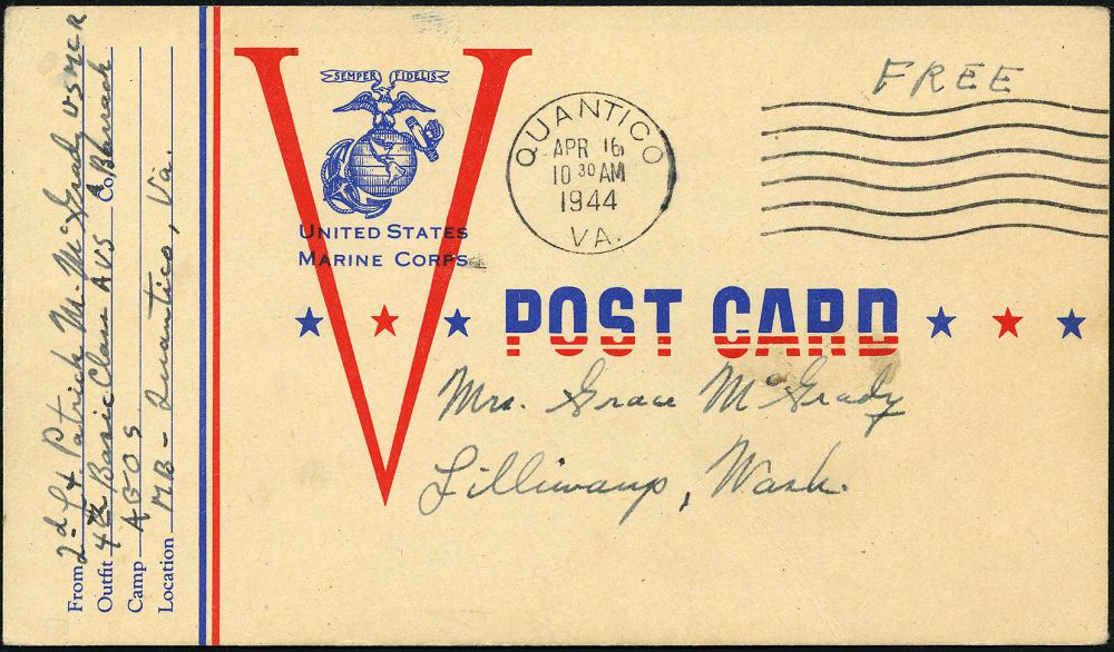 2613 | 15 € | II. WELTKRIEG (1939 - 1945) : U.S.A. 1944 (18.4.) zweifarbige, patriotische Feldpost-Kt. "UNITED STATES MARINE CORPS" = Elite-Einheit mit "V" für Victory , gest. Ma.-WelenSt.: QUANTICO VA/, portofreie Inl.-Feldpost-Kt. | ![]() | |