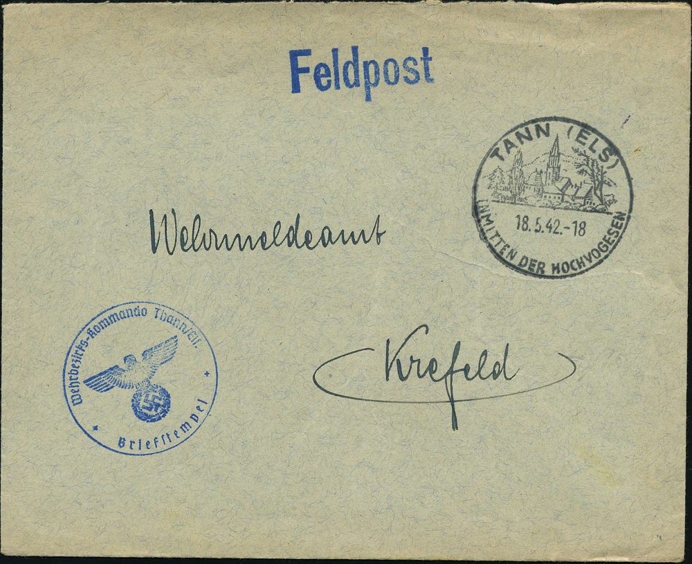 2581 | 12 € | II. WELTKRIEG (1939 - 1945) : SCHWEIZ 1940 Soldatenmarke "SAP. BAT. 5 1940", rot/grün: Bunker (im Wald) 2x viol. Feldpost-2K: STABSKP. SAPPEURBAT./5/ Feldpost (= Pioniere) klar gest. Feldpost-Bf. (Su.14.1) | ![]() | |
