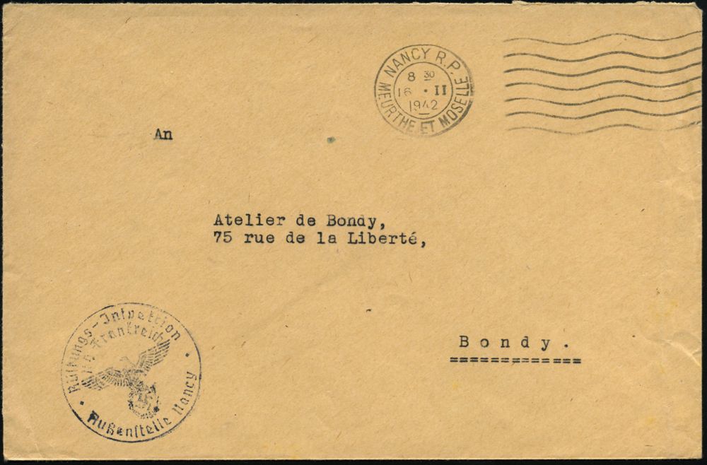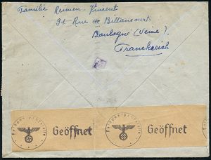 2545 | 45 € | II. WELTKRIEG (1939 - 1945) : FRANKREICH 1942 (29.6.) MaWellenSt.: BOULOGNE BILLANCOURT CENTRE/SEINE auf EF 4 F. Petain + rs. Zensurstreifen: Feldpostprüfstelle/Geöffnet (Mi.1) frankierter Ausl.-Feldpost-Zensur-Bf. an Feldpost-Nr. 16027 = Franzose im Reichs-Arbeitsdienst !, seltener Beleg! (Mi.529 EF) | ![]() ![]() | |