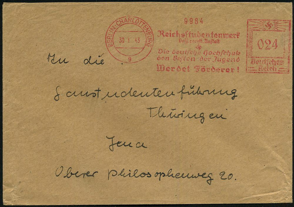 2123 | 20 € | II. WELTKRIEG (1939 - 1945) : BERLIN-CHARLOTTENBURG/ 9/ Reichsstudentenwerk/ Oeff.rechtl.Anstalt/ Die dt.Hochschule/ d.Besten d.Jugend/ Werdet Förderer! 1943 (30.1.) seltener AFS Francotyp "Hakenkreuz" + rs. 1K-HdN: Reichsstudentenführung, klar gest. Inl.-Bf. (Dü.E-3CEh) | ![]() ![]() | |