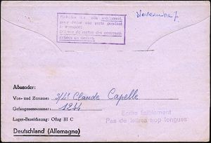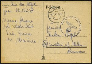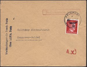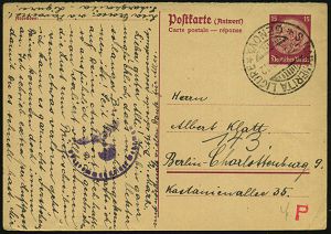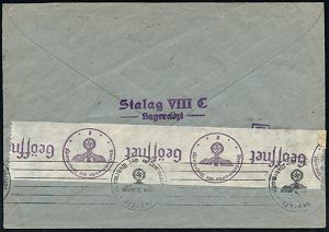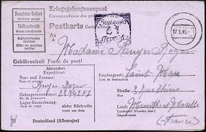 2136 | 45 € | II. WELTKRIEG (1939 - 1945) : Berlin-Lichterfelde 1945 (17.1.) stummer 2K-Steg-MaStpl. ohne Werbung = Tarnstempel Berlin-Lichterfelde + viol. Ra.: Stalag III D/61/Geprüft = Lichterfelde-Süd (Wo.12 f) französ. Kgf.-Klappkt. "Besetztes Gebiet.." m. Antwortteil in Dept. Moselle (ungebr. anhängend) = stummer Überroller, da Elsaß-Lothringen bereits Ende 1944 besetzt war!, siehe A. Meschenmoser !, sehr selten! | ![]() ![]() | |