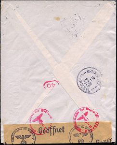 2585 | 16 € | II. WELTKRIEG (1939 - 1945) : SLOWAKEI 1942 (19.10.) 2 Kc. "Europ. Postkongreß Wien", EF + 2K-Steg: BRATISLAVA 1 + rs. OKW-Zensur-Band-ZensurStpl. (4 Linien) + OKW-Zensurstreifen "Geöffnet/g" = Wien (Rie.G-24, G-53 a, + 50 Pkte.) Firmen-Bf.: TUNGSRAM.. = brit. Elektro-Firma (Bf. Mittelfalte) Ausl.-Zensur-Bf. n. Prag (Mi.104 EF) | ![]() ![]() | |