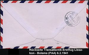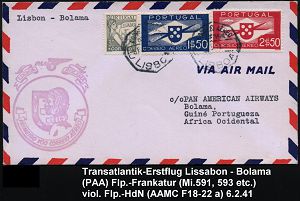 2564 | 25 € | II. WELTKRIEG (1939 - 1945) : PORTUGAL 1941 (6.2.) Erstflug (PAA): Lisboa - Bolama - New York (rs. AS) Flp. 5 E. (Mi.594, 623) rosa PAA-HdN = Flugboot, seltener Kriegs-Transatlantik-Erstflug! Portugal war im II. Wk. lange neutral (AAMC.F 18-22 a) | ![]() | |