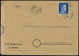 2159 | 18 € | II. WELTKRIEG (1939 - 1945) : EMDEN/ f 1944 (26.9.) alter 1K-Gitter auf EF 25 Pf. Hitler + OKW-Zensurstreifen "b" + roter 1K: "b" = Gestapo-Zensur Berlin! RSHA (Rie. B-5 , B-55, = OKW-Aufbrauch!) Firmen-Bf.: F.W. Barth & Co (23) Emden, seltener Ausl.-Zensur-Bf. n.Schweden (Mi.793 ,EF +15.-EUR) | ![]() ![]() | |