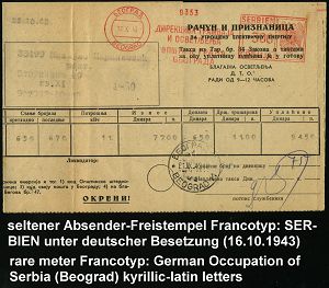 2522 | 65 € | II. WELTKRIEG (1939 - 1945) : DT.BES.SERBIEN 1943 (1.VII.) zweisprachiger AFS Francotyp: SERBIEN/SERBIJA/ BEOGRAD/ DIREKTION DER ELEKTRIZITÄTSWERKE.. 300 Para (kyrill. Text) + 1K: BEOGRAD 11, frankierte Strom-Rechnung, selten! (Francotyp CGh) | ![]() | |