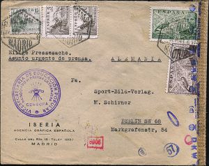 2588 | 25 € | II. WELTKRIEG (1939 - 1945) : SPANIEN 1943 (27.9.) 50 C. u. 2 Ptas. Cierva-Helikopter, 3x 6eck: MADRID.. + viol. 2K-HdN: VICESECRETARIA DE EDUCACION POPULAR/..EXTRANJERA/ CENSURA = Zensur Erziehungs-Ministerium! (Wo. unbekannt!) ua. rs.+ viol. OKW-Bd.Ma.-ZensurSt. "d" = München (Rie.D-21) seltener Ausl.-Flp.-Zensur-Bf. "Eilige Pressesache IBERIA" n. Berlin (Mi.824, 826 u.a.) | ![]() ![]() | |