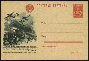 2596 | 18 € | II. WELTKRIEG (1939 - 1945) : UdSSR 1944 Sonder-P. 20 Kop. rot: Siegreicher Angriff.. (Stalin-Zitat 1.Mai) T-34 Panzer, Kampfflugzeuge u. Infanterie , ungebr. selten! (Mi.P 178) | ![]() | |