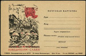 2597 | 15 € | II. WELTKRIEG (1939 - 1945) : U.d.S.S.R. 1945 (Mai) zweifarbige Color-Propaganda-Feldpostkt.: "EHRE DEM SIEGER!" (sowjet. Soldaten, T 34, Flugzeuge) ungebr. (No.867) | ![]() | |
