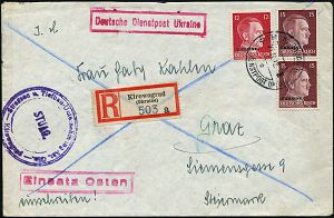 2528 | 28 € | II. WELTKRIEG (1939 - 1945) : DT.BES.UKRAINE 1942 (21.12.) 2K-Steg: KIROWOGRAD/c/DDPU + RZ: Kirowograd/(Ukraine)/a , Hitler 12 Pf. + Paar 15 Pf. + Ra.: Deutsche Dienstpost Osten + Einsatz Osten + viol. Abs.-HdN: Strassen-u. Tiefbau-Unternehmung AG/Kirowograd, Fern-R-Bf. n. Graz (Mi.8, 2x 9) | ![]() | |