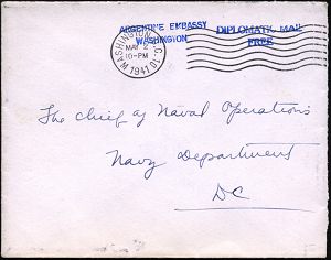 2603 | 18 € | II. WELTKRIEG (1939 - 1945) : U.S.A. 1941 (2.5.) MaWellenSt.: WASHINGTON, D.C. + bl. 2L: DIPLOMATIC MAIN/ FREE + 2L: ARGENTINE EMBASSY/WASHINGTON , portofreier Diplomaten-Bf. an Marine-Chef, Washington, D.C. | ![]() | |
