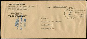 2611 | 15 € | II. WELTKRIEG (1939 - 1945) : U.S.A. 1944 (2.3.) 1K-Killer: U.S. ARMY POSTAL SERVICE/32/A.P.O. + Zusatz: "HQ 32nd Infantry Division" (APO San Francisco) Vordr.-Bf.: WAR DEPARTMENT , Luft-Feldpost-Bf. an War Department Washington D.C., blauer AS: BUREAU OF/PUBLIC RELATIONS.. RECEIVED | ![]() | |