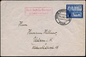 2554 | 30 € | II. WELTKRIEG (1939 - 1945) : ITALIEN / DT.DIENSTPOST ALPENVORLAND 1945 (24.2.) 2-StegK: MERAN/ DEUTSCHE DIENSTPOST ALPENVORLAND , EF 20 + 30 Pf. Postschutztruppe + roter Ra.2: Durch Deutsche Dienstpost/ Alpenvorland, später (überfrankierter) Fernbf. n. Uelzen (Mi.892 EF , + 220.- EUR) | ![]() | |