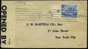 2601 | 18 € | II. WELTKRIEG (1939 - 1945) : U.S.A. 1940 (30.8.) 30 C. "Transatlantik", EF (1K: NEW YORK,N.Y./BRONX..) rs. viol. OKW-Zensur-Band-MaSt + Klebestreifen "e" = Ffm (Rie.E-20, viol. unbekannt !, E-53) Transatlantic-Clipper Zensur-Bf. n.Wien (Mi.450 EF) | ![]() ![]() | |