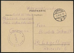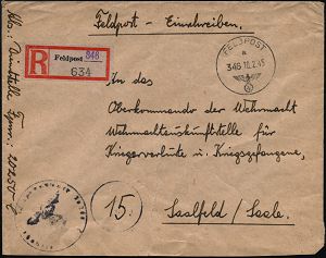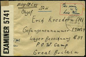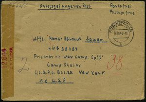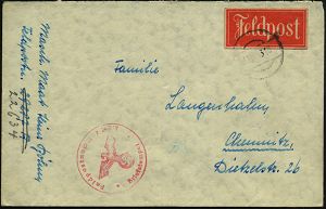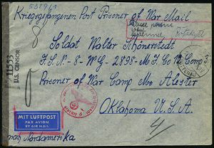 2131 | 28 € | II. WELTKRIEG (1939 - 1945) : BERLIN/ WITTENAU 1944 (28.2.) 1K-Brücke + hs. Vermerk: "Taxe percue 40 RPf..." = Barfrankatur n u r Luftpostgebühr + roter OKW-Zensur-1K: geprüft/b = Berlin (Rie.B-11 a + 200 Pkte.) + Eingangs-Zensur: 11553/US. CENSOR + Klebestreifen, Übersee-Flp.-Kriegsgef.-Doppel-Zensur-Bf. an Camp M. Alester, Oklahoma | ![]() | |