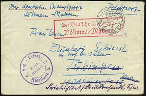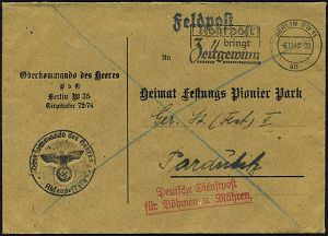 2119 | 18 € | II. WELTKRIEG (1939 - 1945) : BERLIN SW 11/ ah/ Rohrpost/ bringt/ Zeitgewinn 1942 (6.11.) Serien-MWSt + roter 2L: Deutsche Dienstpost/ für Böhnen u. Mähren , Dienst-Feldpost-Bf.: Oberkommando des Heeres.. Tirpitzufer 72-76 + 1K-HdN: Oberkommando des Heeres/ Absendestelle n. Pardubitz (Bo.217 A) | ![]() | |