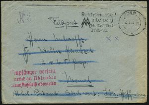 2140 | 18 € | II. WELTKRIEG (1939 - 1945) : BONN 1/ a/ Reichsmesse/ in Leipzig/ Herbst 1941.. 1941 (22.7.) MWSt + roter 3L: Empfänger versetzt/zurück an Absender/Neue Anschrift abwarten (Mi.19.1) Retour-Feldpost-Bf. an "Abhol-Postamt Memel, Komp. zur bes. Verwendung.. Stichwort Ltn. Hoffmann", ungewöhnlicher Beleg! (Bo.S 370 A) | ![]() | |