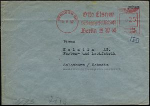 2116 | 15 € | II. WELTKRIEG (1939 - 1945) : BERLIN SW 68/ Otto Elsner/ Verlagsgesellschaft 1942 (15.9.) AFS Francotyp "Reichsadler" 025 Pf. + rs. OKW-Zensurstreifen "e" + 3x roter 1K: "e" = Frankfurt/M. (Rie.E-3 a, E-54) rs. Abs.-Vordruck (Bf. schwache Querfalte u. Eckriß) Ausl.-Zensurbf. n. Solothurn/Schweiz (Dü.E-5) | ![]() ![]() | |