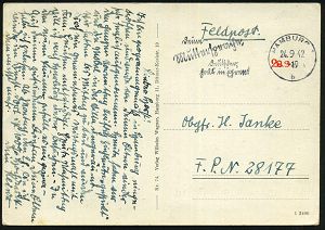 2175 | 25 € | II. WELTKRIEG (1939 - 1945) : HAMBURG 1/ b/ Deine/ Muttersprache,/ Deutscher/ halt in Ehren! 1942 (24.9.) Serien-MWSt, Text Sütterlin, s/w.-Feldpost-Foto-Ak. (Chilehaus, Messberghof) an Feldpost-Nr. 28 177 = Abt. "Fremde Heere Ost" = Geheimdienst, Gruppe Gehlen, später Chef des BND, B.R.D.! (Bo.S 180 A) | ![]() ![]() | |