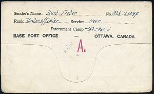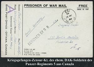2539 | 25 € | II. WELTKRIEG (1939 - 1945) : CANADA / DEUTSCHES REICH 1943 (14.9.) 1K: P.O.W./132 + schw. Zensur-1L: EXAMINED BY CENSOR (Wo.5) + viol. OKW-Zensur-1K: A b = Berlin (Rie.B-33, + 250 Pkte.) Kgf.-Doppel-Zensur-Bf. = ex D.A.K.-Soldat Panzer Rgt. 5 (Fp.-Nr. 28 770) mittig OKW-Text-Schwärzung! n. Berlin-Neukölln (vergl. Los Nr. 2386) | ![]() ![]() ![]() | |