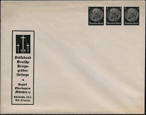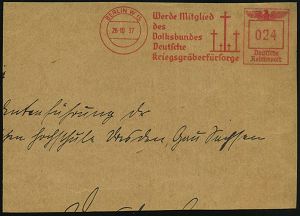 2090 | 18 € | II. WELTKRIEG (1939 - 1945) : BERLIN W15/ Werde Mitglied/ des/ Volksbundes/ Deutsche/ Kriegsgräberfürsorge 1937 (26.10.) seltener AFS Francotyp "Reichsadler" (5 Kreuze) auf Teil-Vorderseite (kl. Rißchen), grgründet für die Kriegsgräber-Betreuung des I. Weltkriegs und dann auch für die Gräber des II. Weltkriegs!, vergl. Los Nr. 2097 (Dü.E-5CG) | ![]() | |