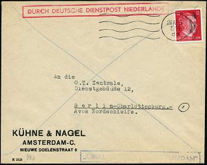 2602 | 28 € | II. WELTKRIEG (1939 - 1945) : U.S.A. 1940 (7.11.) frankierter Dienst-Bf.: Deutsches Konsulat (German Consulate)/..Detroit, Mich. , US-Frankatur 8 C. + roter Durchlauf-Zensur-1K: "A e" (= Ffm, Rie.30a) ohne Verschlußstreifen! , seltener Übersee-Zensur-Bf. n.Oscher/Westpr., das Konsulat wurde mit US-Kriegseintritt 1941 geschlossen! (Mi.414, 458) | ![]() | |