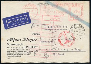 2160 | 25 € | II. WELTKRIEG (1939 - 1945) : ERFURT/ Alfons Ziegler/ Samenzucht.. 1943 (29.3.) AFS Francotyp "Hakenkreuz" 016 Pf. + 1K-Brücke: ERFURT/a 1 b + roter OKW-Zensur-1K: Geprüft/c/52 = Köln + chemische Zensur! (blauer Streifen) seltene Ausl.-Flp.-Zensur-Kt. n. Holland, seltene Portostufe = Europa-Tarif Luftpost! (Dü.E-3CE) | ![]() | |