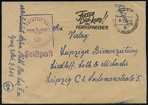 2169 | 15 € | II. WELTKRIEG (1939 - 1945) : GRAZ/ 1/ ag/ SDV/ Fasse/ Dich kurz!!/ am/ FERNSPRECHER 1944 (30.3.) Serien-MWSt (bezieht sich alliierte Luftantgruiffe !) + viol. Ra.: Res. Lazarett Ii Graz/ Feldpost , Feldpost-Bf. n. Leipzig (Bo.S 414 A. Erstjahr!) | ![]() | |