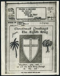 2609 | 25 € | II. WELTKRIEG (1939 - 1945) : U.S.A. / GROSSBRITANNIEN 1943 (7.11.) Airgraph "Christmas Greetings The Eights Army.." mit Wappen, Palme etc. (Bugspur) = 8. Armee Nordafrika. Gegegenspieler des D.A.K. n. Stoke-On-Trent, G.B. | ![]() | |