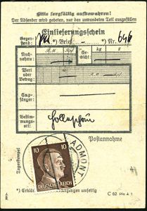 2087 | 30 € | II. WELTKRIEG (1939 - 1945) : ADMONT/ e 1942 (15.5.) 1K-Brücke auf EF 10 Pf. Hitler auf Post-Einlieferungsschein (Form C 62 Din A 7) = Annahmegebühr Landzusteller für Pakete, "Ostmark"-Verwendung!, seltene Portostufe als Formular-Frankatur! (Mi.787 EF, + 75.- EUR) | ![]() | |