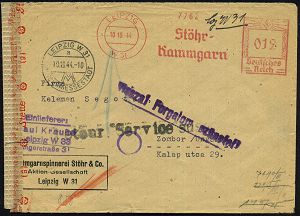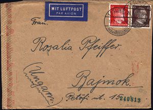 2600 | 18 € | II. WELTKRIEG (1939 - 1945) : UNGARN 1941 (9.9.) 20 f. Hl. Stephan (St. Istvan) 4 Stück + 10 f. Stephans-Krone = satzreine Frankatur , 1K + rot/grüner RZ: Ujverbász ,Firmenbf. (Merkator) + OKW-Eingangs-Zensurstreifen "g" + roter Segm.-1K (= Wien, Rie.G-3 a, G-53 a) dekorativer Ausl.-Zensur-R-Bf. n. Cilli (Mi.603, 4x 605) | ![]() ![]() | |