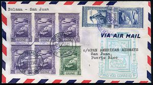 2566 | 25 € | II. WELTKRIEG (1939 - 1945) : PORTUG.GUINEA 1941 (6.5.) Erstflug (PAA): Bolama - Nordamerika, Etappe Puerto Rico, San Juan (AS) schöne Flp.-Frankatur (Mi.5x 242 u. 244, 246 etc.) grüner Flp.-HdN: PRIMEIRO VOO CORREIO POSTAL/BOLAMA/SAO JOAO (= Ausweich-strecke Lisboa - USA), seltene Etappe u. Kriegs-Erstflug! (Mu.1 / AAMC.F 18-23 b) | ![]() | |