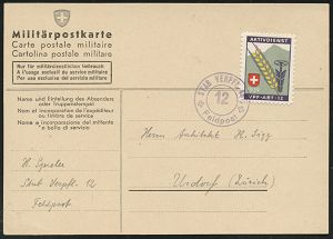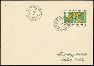 2574 | 14 € | II. WELTKRIEG (1939 - 1945) : SCHWEIZ 1939 Soldatenmarke "AKTIVDIENST 1939": VPF-ABT-12 = Verpflegungs-Abteilung (Lenkrad, Ähre) viol. Feldpost-2K: STAB VERPFL. ABT./12/Feldpost, Feldpost.-Vordr.-Kt., = Teil-Mobilmachung der Schweiz 1939 | ![]() | |