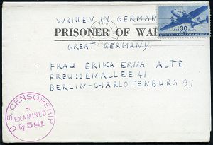 2549 | 35 € | II. WELTKRIEG (1939 - 1945) : GROSSBRITANNIEN 1942 (23.2.) Kgf.-Luftpost-Aerogramm "PRISONER OF WAR POST" + roter Zensur-Ra.: PASSED/P.U. 48 (Wo. unbekannt) an Stalag III D = Berlin-Lichterfelde (teils undeutl., Wo.12) mit Inhalt, n u r Luftpostgebühr, sonst portofrei! (Mi.FLF 1 + 60.- EUR (2003), Mi.225) | ![]() ![]() | |