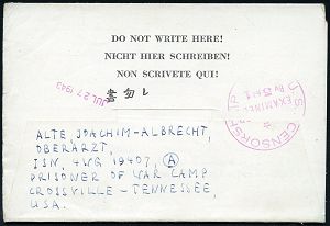 2608 | 25 € | II. WELTKRIEG (1939 - 1945) : U.S.A. 1943 (9.8.) 30 C. Flp., blau EF + viol. Zensur-1K: U. S. CENSORSHIP/*/ EXAMINDED/By 581 (Wo.2) = Kgf.-Lager Crossville, Tennessee + rs. viol. Uhrzeit-HdN: DISPATCHED/ ..Prioner of War Camp/Crossville,/Tenn., o h n e OKW-Eingangs-Zensur! wg. Ausbombung der Dienststelle Berlin !, selltener Übersee- ÜberTranatlantik-Flp.-Zensur-Bf. mit Inhalt n. Berlin (Mi.505 EF) | ![]() ![]() | |