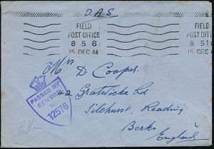 2552 | 10 € | II. WELTKRIEG (1939 - 1945) : GROSSBRITANNIEN 1944 (15.12.) Band-MaWellenSt.: FIELD/POST OFFICE/ 8 5 6 + hs. "O. A. S." + viol. Zensur-Schild: PASSED BY/CENSOR/No./12576 (Wo.3) klar gest. Inl.-Feldpost-Zensur-Bf. (n. Reading) | ![]() | |