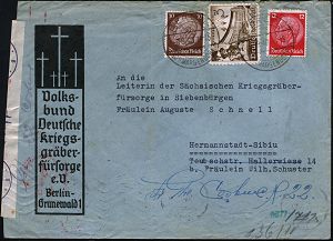 2097 | 20 € | II. WELTKRIEG (1939 - 1945) : BERLIN-/ SCHMARGENDORF/ h 1940 (6.9.) 1K-Brücke auf Dienst-Bf.: Volksbund Deutsche Kriegsgräberfürsorge e.V. (Kreu-ze) + OKW-Zensurstreifen "g" = Wien (Rie.G-53 a) an Kriegsgräberfürsorge Siebenbürger Sachsen in Hermannstadt(Rumänien) , seltener Ausl.-Zensur-Bf., rs. AS. (vergl. Los Nr. 2090) | ![]() ![]() | |