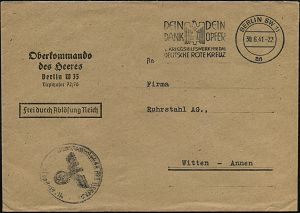 2103 | 18 € | II. WELTKRIEG (1939 - 1945) : BERLIN SW11/ an/ ..2.KRIEGSWHW FÜR DAS/ DEUTSCHE ROTE KREUZ 1941 (30.6.) MWSt (RK-Logo mit Hakenkreuz) Dienst-Bf.: Oberkommando des Heeres/ FdAR + HdN (etw. undeutl.) an Rüstungsbetrieb! wenige Tage nach Beginn Operation "Barbarossa" am 22.6. ! (Bo.S 377 A) | ![]() | |