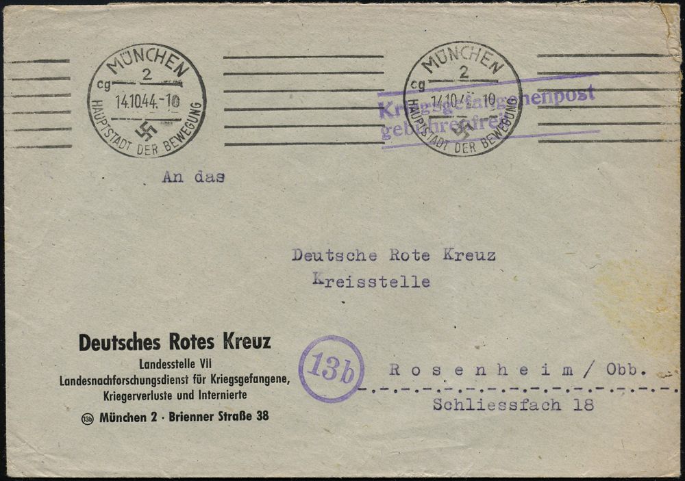 2743 | 15 € | KGF-POST II. WELTKRIEG (ab 1939) : MÜNCHEN/ 2/ cg/ HDB 1944 (14.10.) Band-MWSt auf Dienst-Bf.: Deutsches Rotes Kreuz.. Landesnachforschungsstelle für Kriegsgefangene/ Kriegerverluste u.Internierte + viol. 2L: Kriegsgefangenenpost / gebührenfrei (Bf. kl. Eckriß) = WASt-Vorläufer | ![]() | |