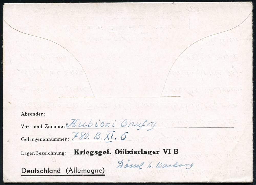 2747 | 20 € | KGF-POST II. WELTKRIEG (ab 1939) : Warburg-Dössel 1944 (26.9.) stummer 2K-Steg = Tarnstempel Warburg-Dössel + viol. Zensur-Ra.4: Oflag VI - B/Geprüft:/4 a/____ (Wo.18) Kgf.-Falt-Vordruck-Bf. aus Lager Dössel mit Inhalt n. Wien | ![]() ![]() | |