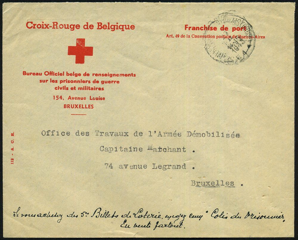 2762 | 15 € | KGF-POST II. WELTKRIEG (ab 1939) : BELGIEN 1943 (27.11.) Rotkreuz-Dienst-Bf.: Croix-Rouges de Belgique / Bureau Officiel belge de renseignements/sur les prisonniers.. (Rotes Kreuz) französ. Vordruck, Ortsbf. an Armee-Demobilisierungs-Büro, Brüssel | ![]() | |
