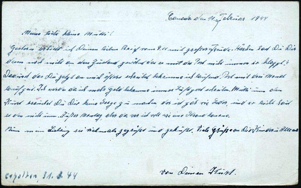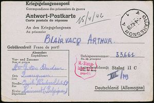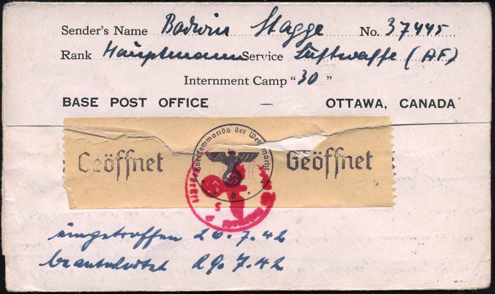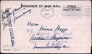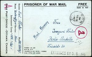 2764 | 20 € | KGF-POST II. WELTKRIEG (ab 1939) : CANADA / DEUTSCHES REICH 1944 (12.2.) 1K: P.O.W./132 + schw. Zensur-1L: EXAMINED BY D.B.... + hs. Nr. 607 + r o t e r OKW-Zensur-1K: A b = Berlin (Rie. B-32 rot = selten!) Kgf.-Vordr.-Doppelzensur-Kt. (= ehem. D.A.K.-Soldat, Panzer Rgt. 5, Fp.-Nr. 28 770) n. Berlin-Neukölln (vergl. Los 8058) | ![]() ![]() | |