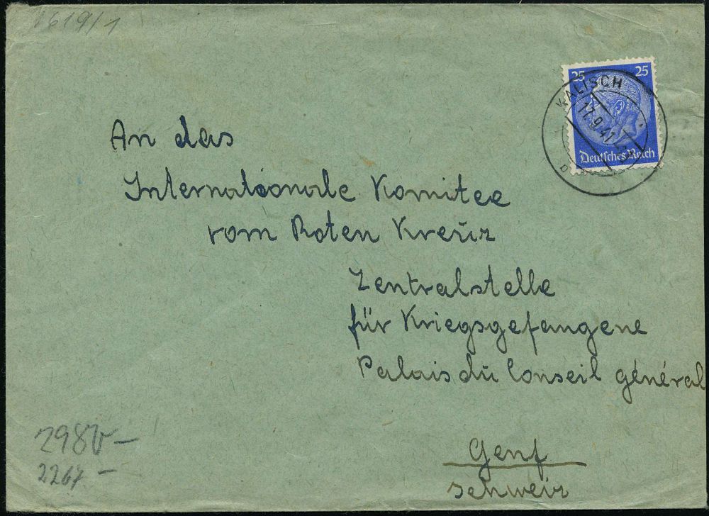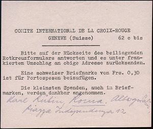 2774 | 25 € | KGF-POST II. WELTKRIEG (ab 1939) : SCHWEIZ 1944 (11.2.) AFS: GENEVE 11/4552/*** ohne Text = Comité I.R.K. klar auf Dienst-Bf.: INTER ARMA CARITAS/COMITE INTERNAT. DE LA CROIX-ROUGE (Rotes Kreuz) + Inhalt: Merkzettel u. Briefbogen m. Adreßnachweis eines Gesuchten, 3 Belege! | ![]() ![]() ![]() | |