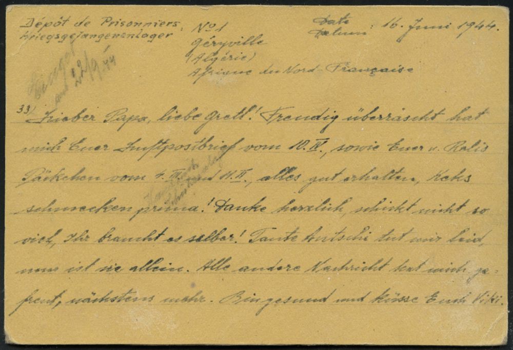 2756 | 20 € | KGF-POST II. WELTKRIEG (ab 1939) : ALGERIEN / DEUTSCHES REICH 1944 (18.1.) bl. Zensur-1K: DEPOT DE G.P.A. No.I/CONTROLE/PAR/No.6 (Wo. unbekannt!, ähnl. Wo.3) hs. Abs.: "..Lager No. 1 Geryville Algérie.."+ roter OWK-1K: b Geprüft b mit Punkt (= Berlin, Rie. B-12 b ,+ 750 Pkte.!, Kgf.-Doppel-Zensur-Kt. n. Wien | ![]() ![]() | |