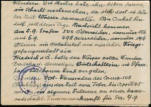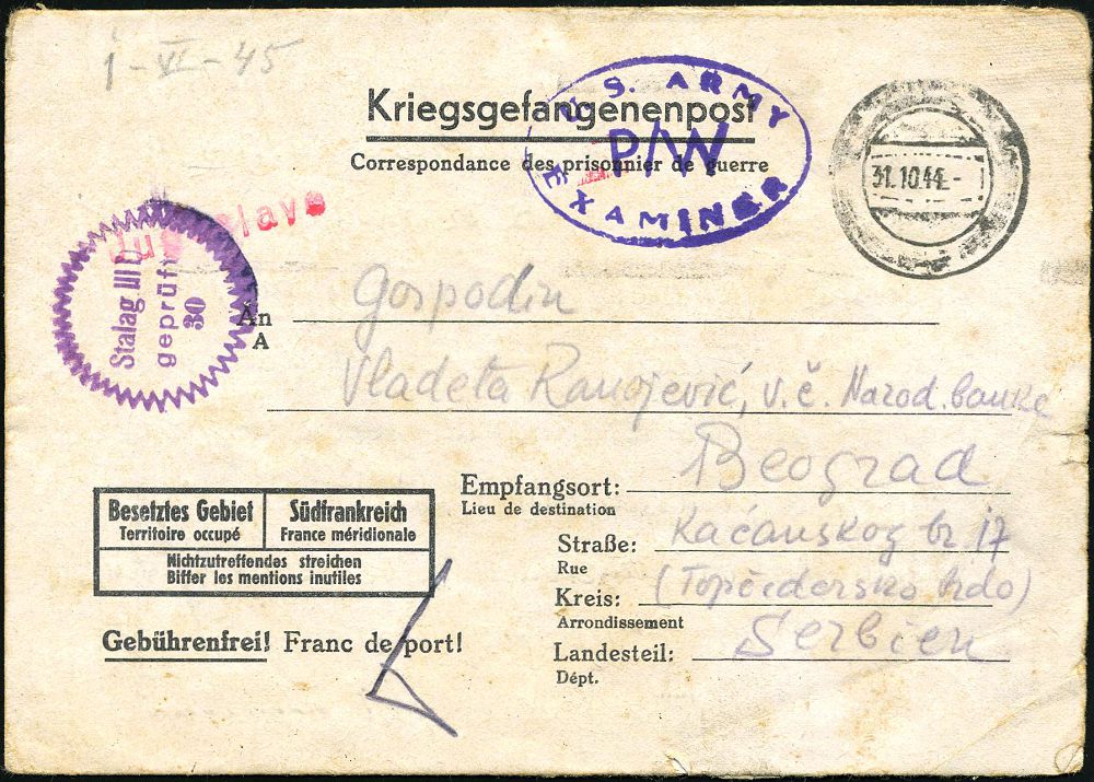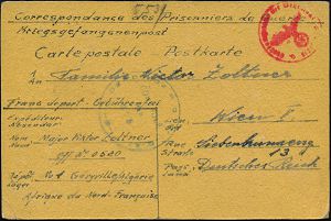 2737 | 45 € | KGF-POST II. WELTKRIEG (ab 1939) : Fürstenberg 1944 (31.10.) stummer 2K-Steg = Tarnstempel Fürstenberg a. französ.-deutscher Kgf.-Vordr.-Bf. "Besetztes Gebiet Südfrank-reich" für jugoslaw. Kgf.! , viol. Zensur-Zackenkranz: Stalag III B/geprüft/30 (Wo.10 f, Sonderform unbekannt!) + rs. viol. 1L: M-Stammlager III B + viol. Oval-Zensur: U.S. ARMY/P-W/EXAMINER = Ü b e r r o l l e r ! nach Beograd mit anhändendem , ungebr. Antwortteil!, selten! (hs. Datums-Vermerk "1-VI-45") | ![]() ![]() | |
