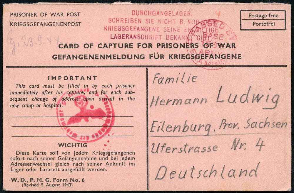 2808 | 30 € | KGF-POST II. WELTKRIEG (ab 1939) : U.S.A./ DEUTSCHES REICH 1944 (Sept.) roter Zensur-1K: PASSED BY/EXAMINER/BASE/1567/US ARMY + roter 4L: Durchgangslager/ SCHREIBEN SIE NICHT BEVOR.. LAGERANSCHRIFT BEKANNT.. auf rosa Kgf.-Karte: PRISONER OF WAR POST.. Postage free + roter OKW-1K-Zensur: Geprüft/ b b + Punkt = Berlin (Rie.12 b + 750 Pkte.!) n. Eilenburg (Eingangsnotiz 23.9.44) | ![]() ![]() | |